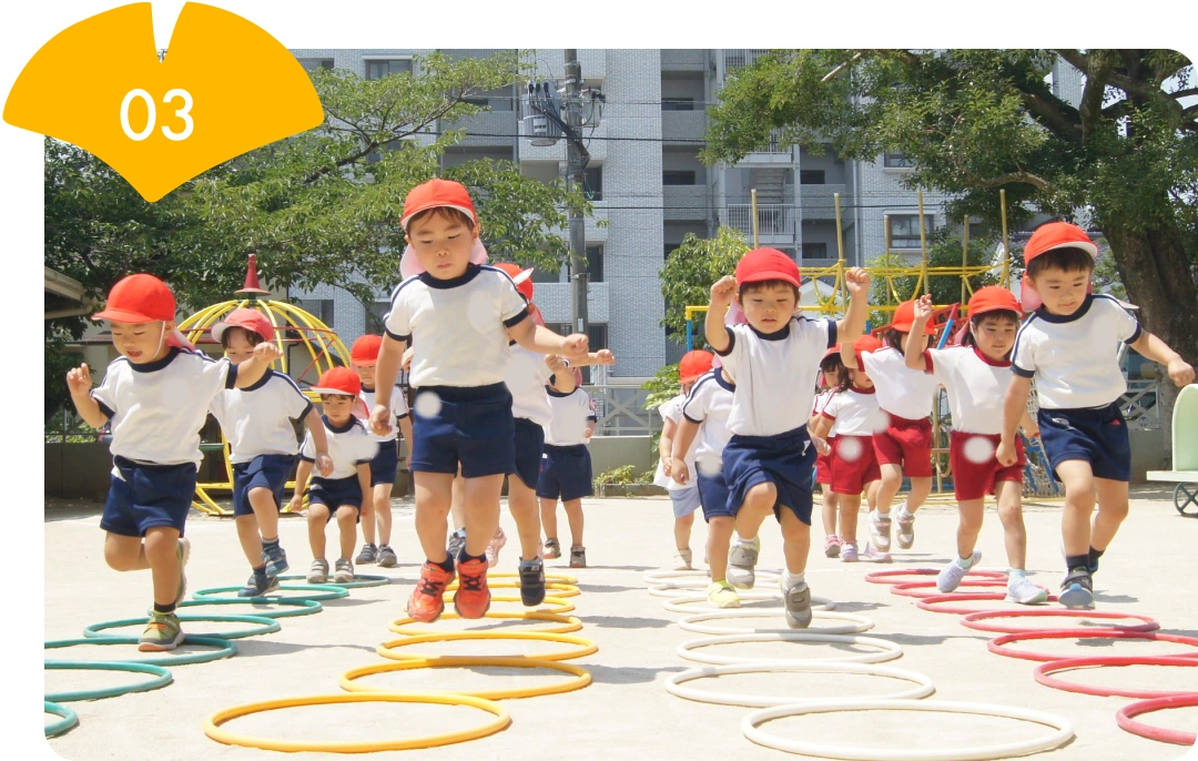 子どもたちの成長は、精神的、身体的発達の両面が要求されます。戸外の活動を重視して心と体を解放し、基礎体力や運動能力の発達をはかり、バランスのとれた健康で明るい子どもたちを育てます。